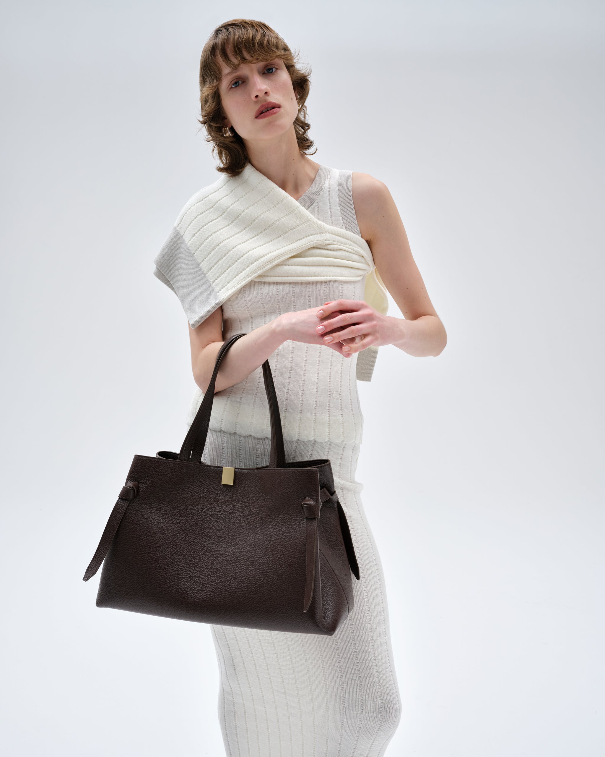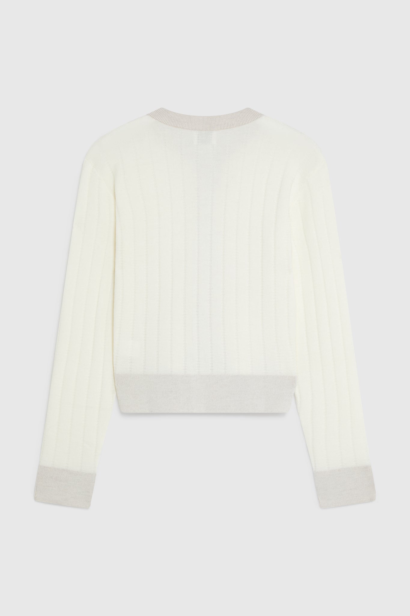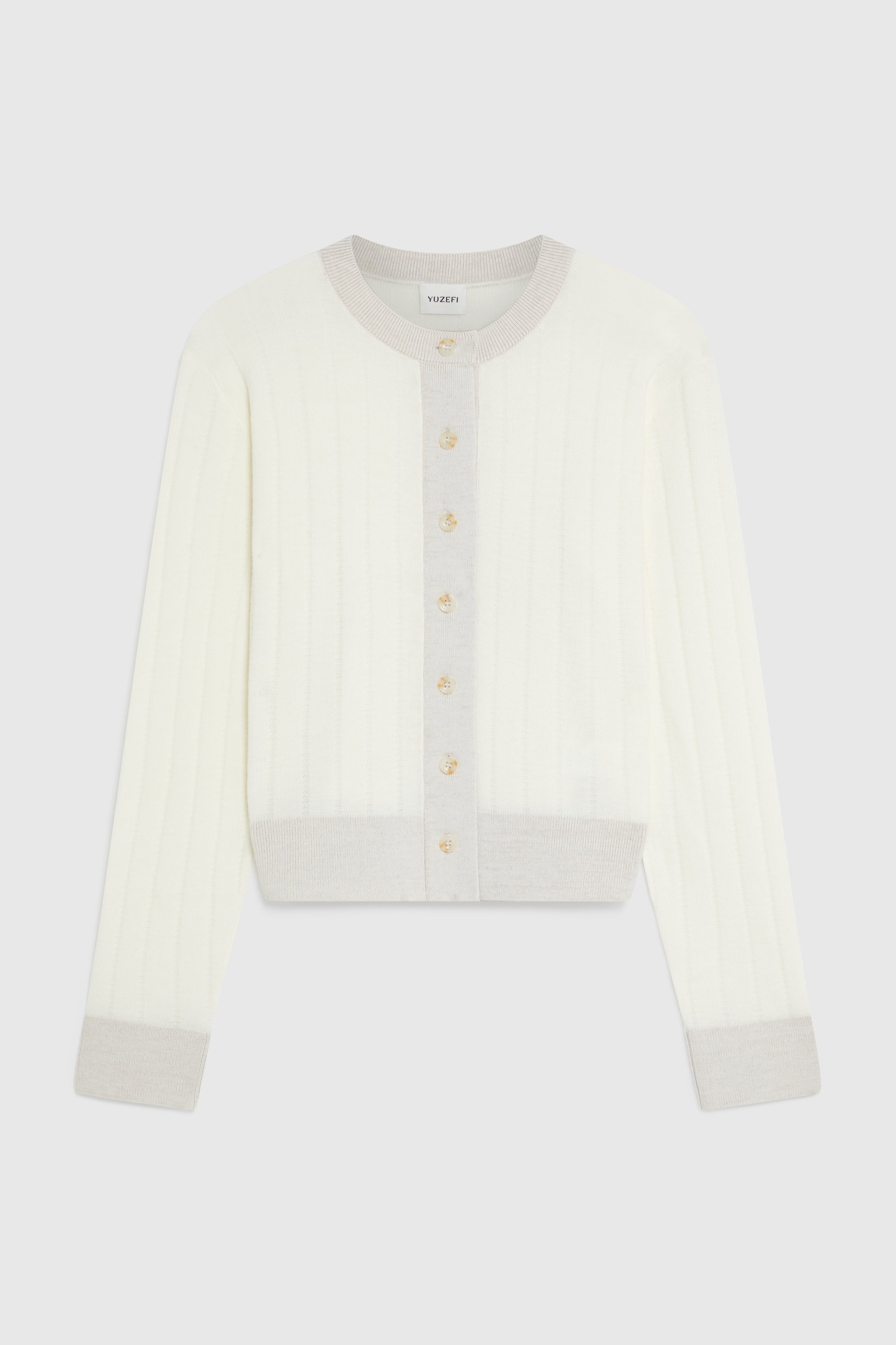 A softly structured Merino wool cardigan in oatmeal with a clean tuck stitch texture and a subtle seven-button placket.