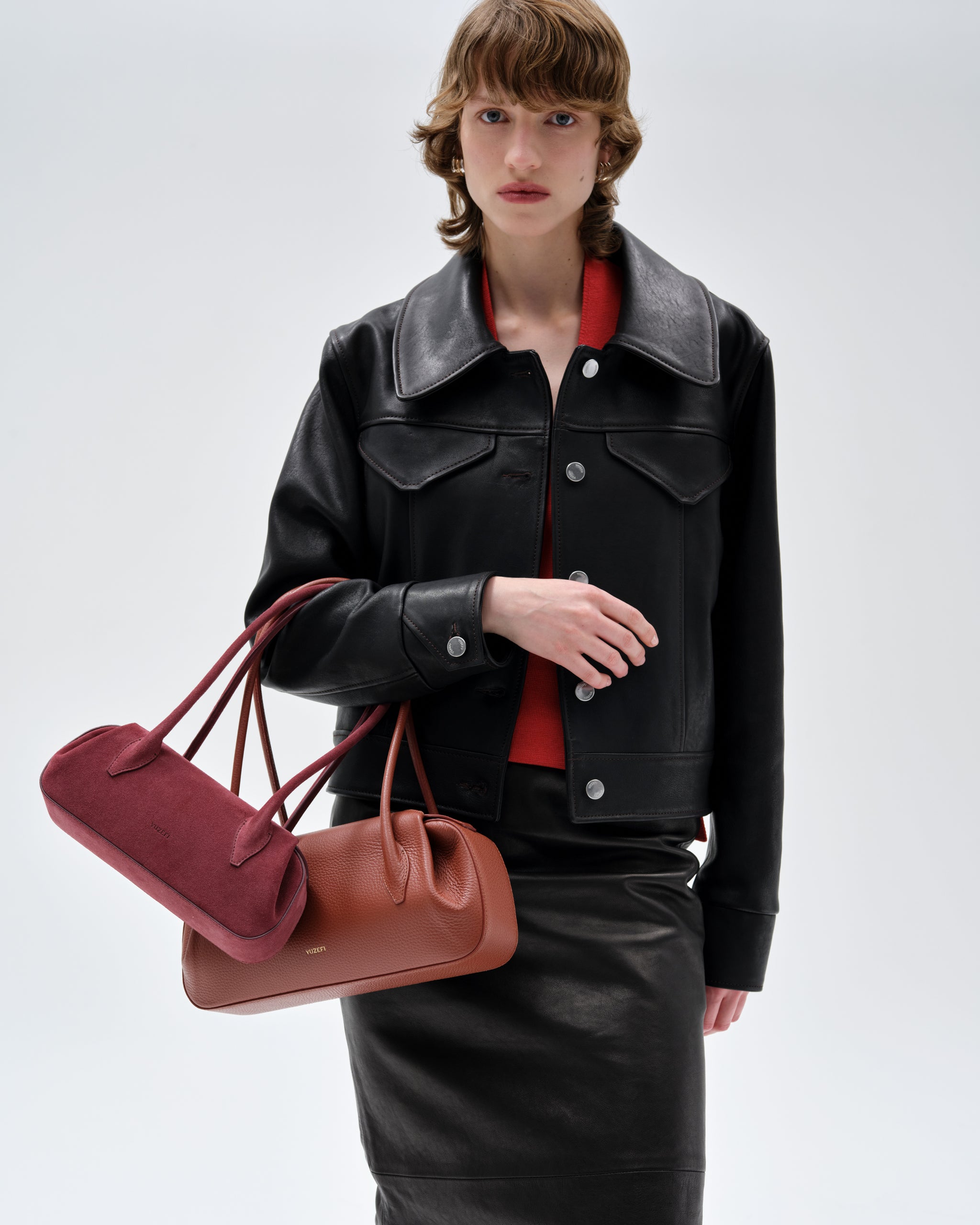 Oyster Mini Shoulder Bag, crafted from Wine Suede.