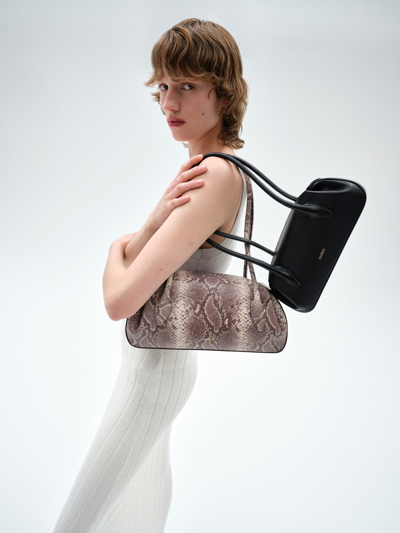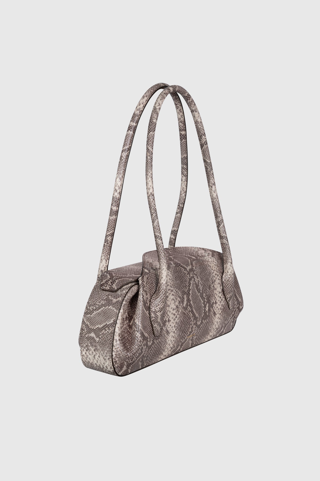 Oyster Shoulder Bag, crafted from Embossed Ash Snake cowhide leather.