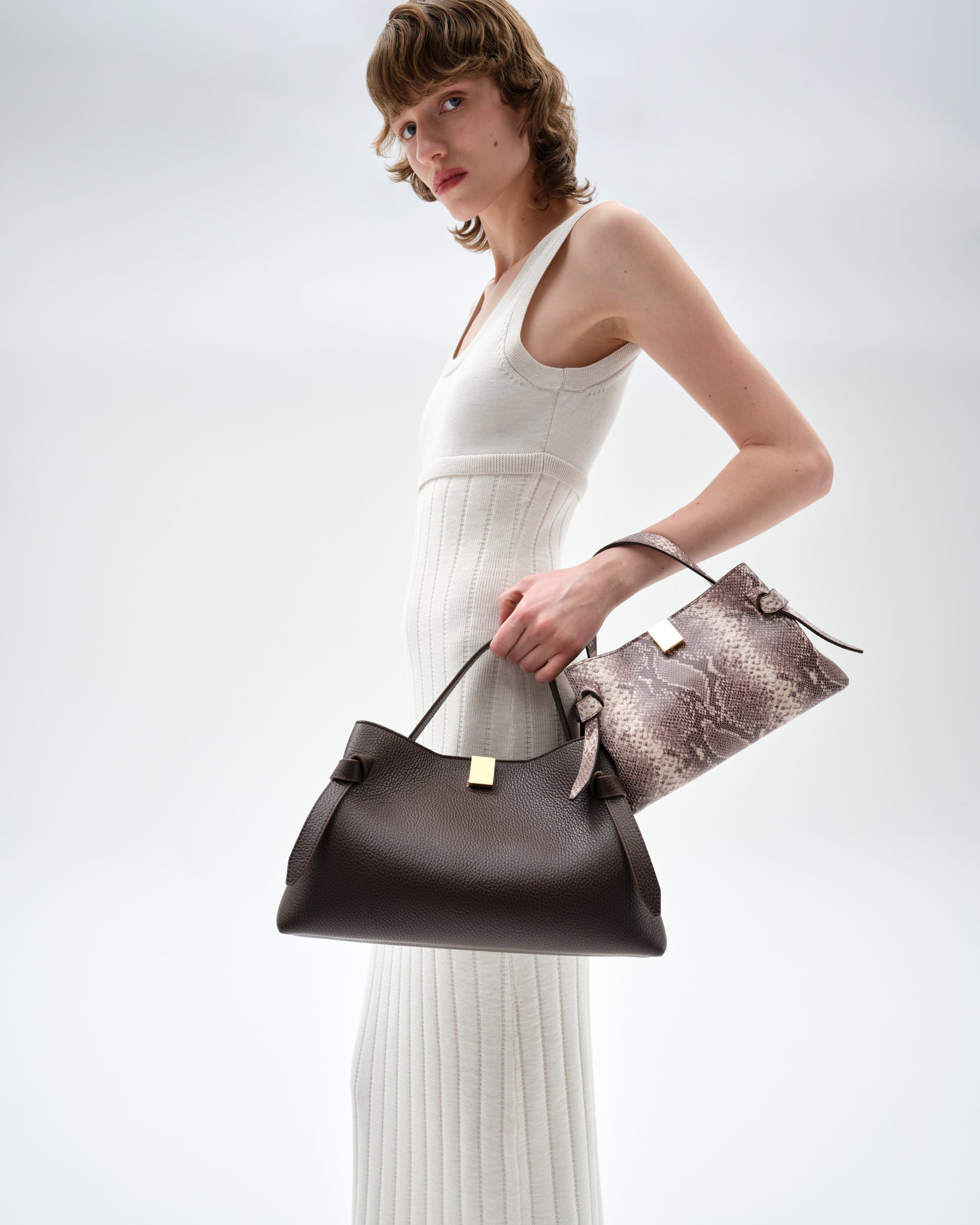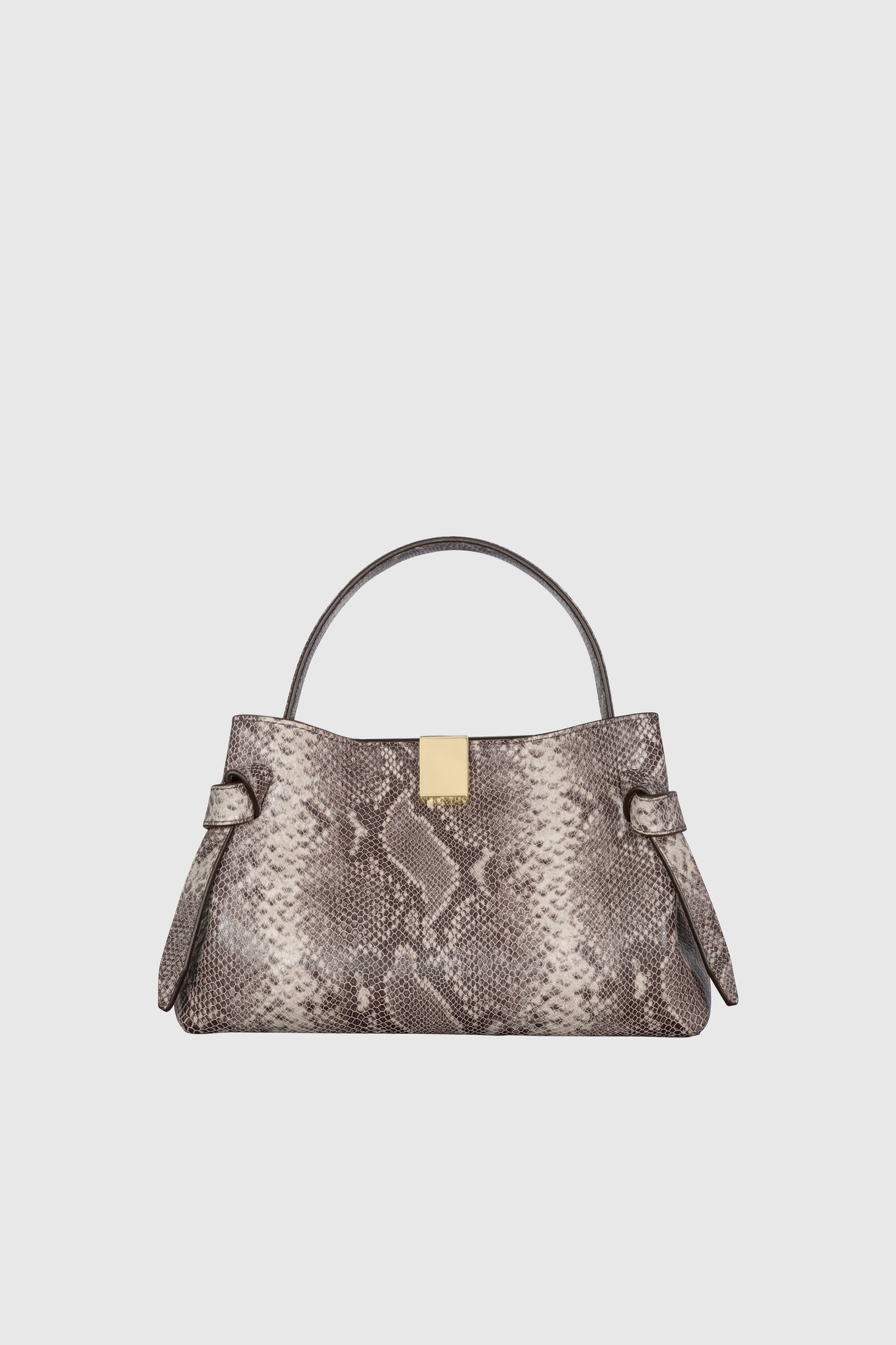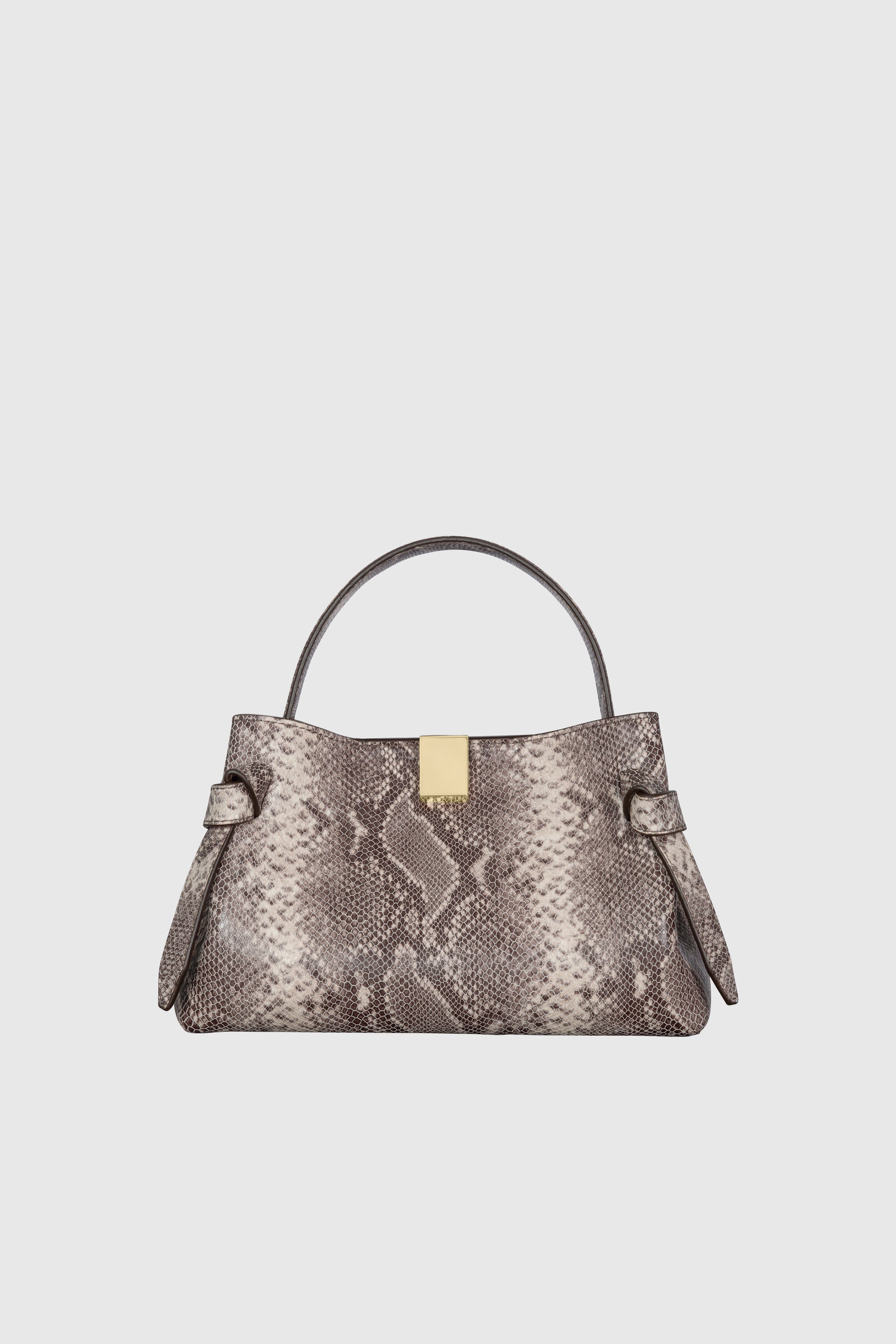 The Mini Gyoza is a sculptural top-handle bag crafted from luxurious embossed ash snake cowhide leather, with elegant gold-tone hardware.