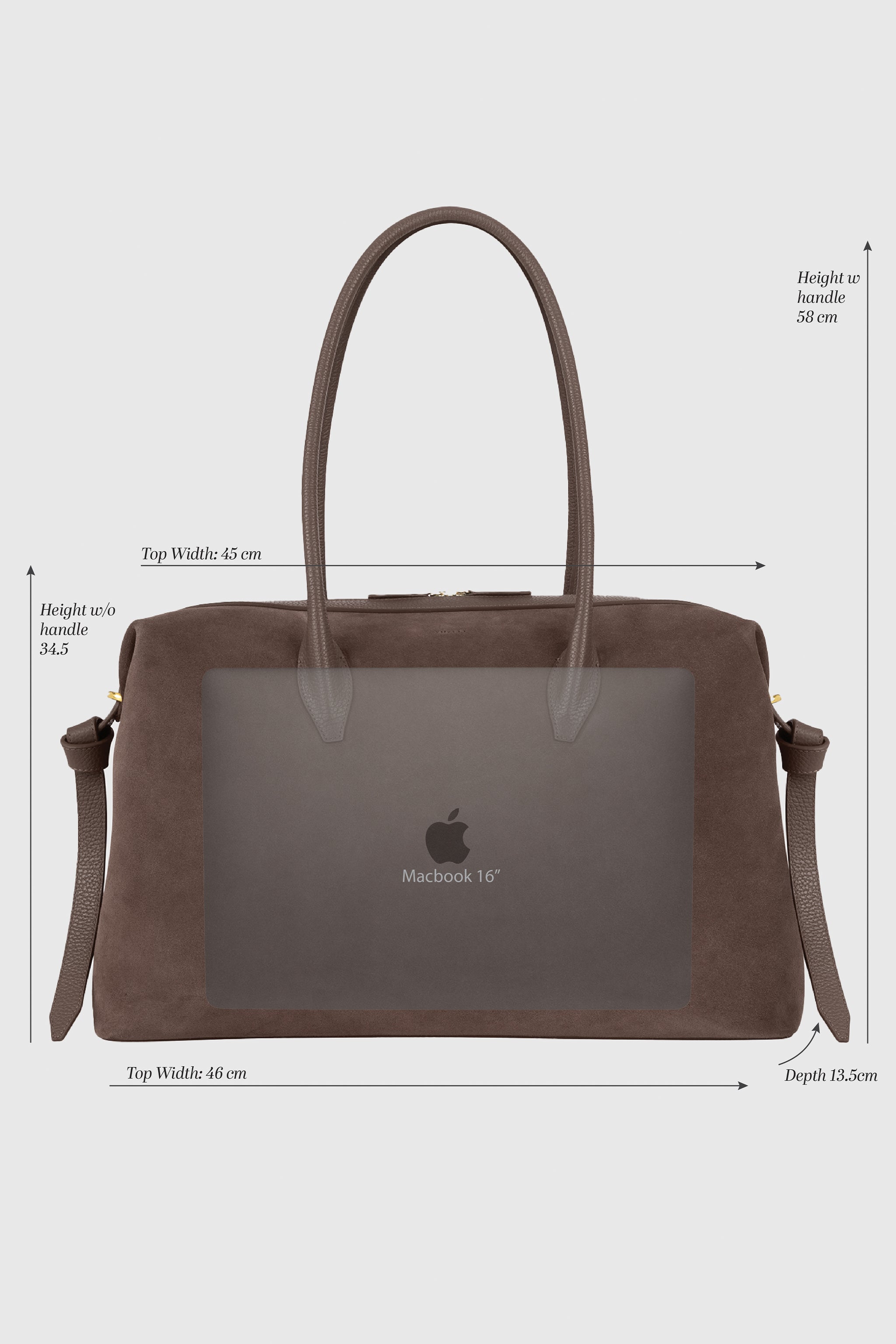 Sleek and sophisticated, the nutmeg suede Brioche Duffle offers a spacious interior and a luxurious feel. Perfect for carrying your essentials and more with style and ease.